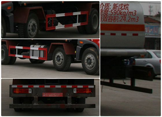 | 整車(chē)說(shuō)明: | 罐體有效容積:20.3立方米,介質(zhì): 庚烷,汽油,類(lèi)項(xiàng)號(hào):3,密度:700千克/立方米.罐體外形尺寸長(zhǎng)7910毫米,長(zhǎng)軸2360毫米,短軸1630毫米.隨底盤(pán)選裝駕駛室及出口箱.側(cè)、后防護(hù)裝置材料材質(zhì):Q235B,側(cè)、后防護(hù)均用螺栓連接,后部防護(hù)裝置斷面尺寸(寬×高)60×100(mm),后部防護(hù)離地高度:540mm.安裝具有衛(wèi)星定位功能的行駛記錄儀,安裝前輪盤(pán)式制動(dòng)器,僅采用底盤(pán)子午線(xiàn)輪胎.ABS生產(chǎn)廠(chǎng)家:上海萬(wàn)捷汽車(chē)控制系統(tǒng)有限公司,ABS型號(hào): VIE ABS-II.油耗值39.4,38.7,39.3,39.5,40.3分別對(duì)應(yīng)發(fā)動(dòng)機(jī)CA6DF4-24E4,CA6DF4-22E4,BF6M1013-24E4, BF6M1013-26E4,CA6DL1-26E4. | ||
