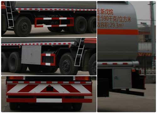 | 整車說明: | 罐體有效容積:29.3立方米,介質:新戊烷,類項號:3,密度:590千克/立方米,罐體尺寸:長9000毫米,長軸2450毫米,短軸1690毫米.隨底盤選裝駕駛室,選裝罐頂護欄和尾部爬梯.側、后防護裝置材料材質:Q235B,側、后防護均用螺栓連接,后部防護裝置斷面尺寸(寬×高)60×100(mm),后部防護離地高度:540mm.安裝具有衛(wèi)星定位功能的行駛記錄儀,安裝前輪盤式制動器,僅采用底盤子午線輪胎.ABS生產(chǎn)廠家:東風電子科技股份有限公司制動系統(tǒng)公司;型號:3631010-C2000 | ||