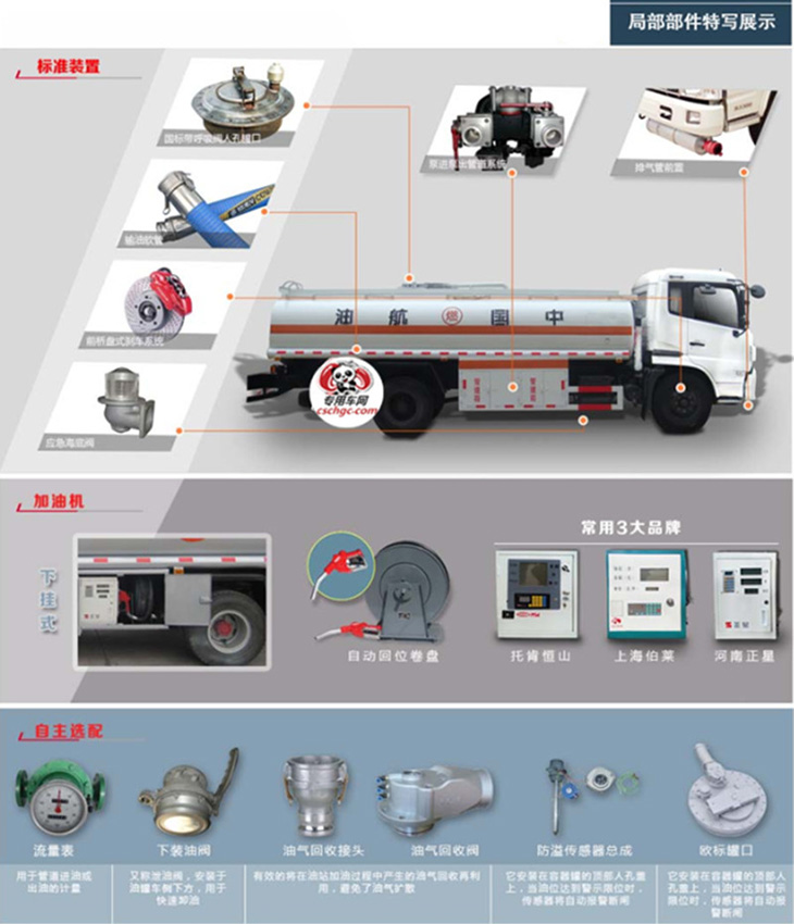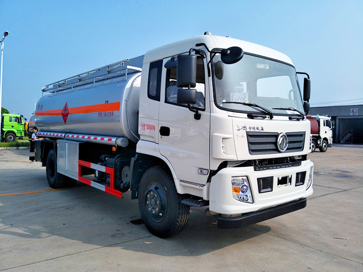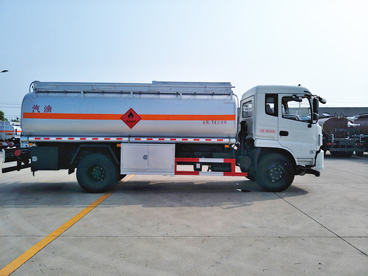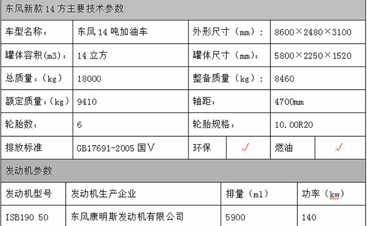 東風(fēng)D913駕駛室,康明斯190馬力國五發(fā)動機東風(fēng),陜齒小八檔變速箱,方向助力,斷氣剎,前盤制動,限速裝置,排氣制動,ABS防抱死系統(tǒng),10.00R20原廠鋼絲胎,6噸前橋,9噸后橋。罐體有效容積14立方,(加油機側(cè)掛),標配帶歐標罐口、緊急切斷裝置(海底閥),罐體采用武漢鋼鐵公司Q235優(yōu)質(zhì)國標5mm碳鋼板材一次卷壓成型,電腦自動焊,完全做到無縫成型.罐體內(nèi)均設(shè)有多道防波隔板,采用高壓氣體試漏檢測,試水檢測,探傷檢測,使罐體具有強度高,重心穩(wěn),車輛運載安全平穩(wěn)等特點.整個罐體分單倉或多倉,倉內(nèi)可分室,中間隔板下端有通孔,每倉中間焊有分倉加強波隔板,以減輕汽車行駛時罐體內(nèi)油料的沖擊和提高罐體的剛度.罐體外表涂防銹漆及裝飾漆.罐體及各保險杠貼紅白色視覺反光條,罐體兩側(cè)貼“爆”字,自動呼吸閥裝置。