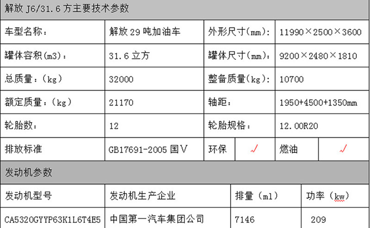 解放J6M高頂雙臥豪華駕駛室,大柴285馬力國(guó)五發(fā)動(dòng)機(jī)(FCRI+SCR氣驅(qū)、雙腔空壓機(jī)),解放九檔變速箱(法蘭輸出取力器),440后橋,12R22.5型(鋁合金輪輞),自動(dòng)空調(diào)、300L鋁油箱、鐵保險(xiǎn)杠、高效單空濾、鋁散熱器、駕駛室后兩點(diǎn)空氣懸置、電動(dòng)液壓舉升裝置、懸架為前少/后氣囊、前后盤式制動(dòng)器、排氣尾管前置、車輛限速裝置、排氣火花熄滅器、整車配備靜電拖地帶2根、150Ah蓄電池、前下防護(hù)裝置。